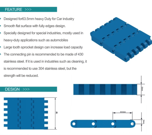 * Large tooth sprocket design can increase load capacityThe connecting pin is recommended to be made of 430stainless steel. lf it is used in industries such as cleaning, itis recommended to use 304 stainless steel, but thestrength will be reduced.